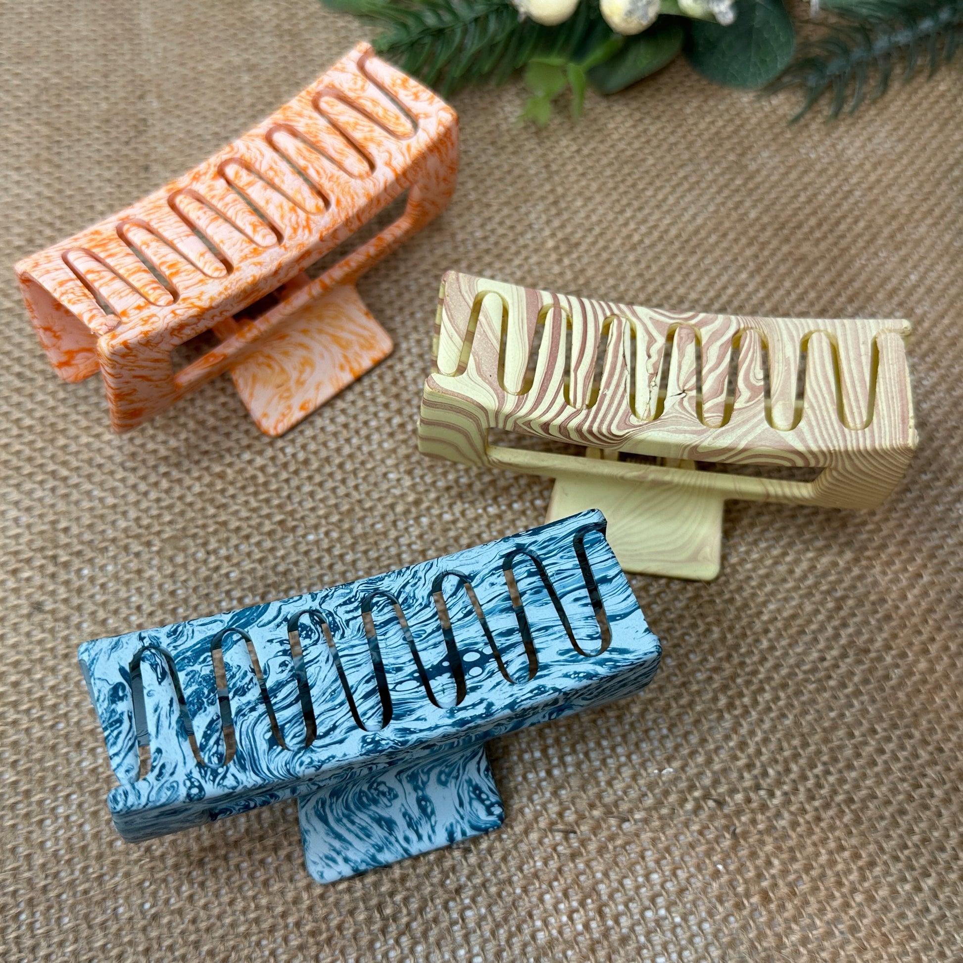 Upgrade your hair accessory game with the small Splatter Claw. Expertly crafted for maximum hold and style, this oversized claw is designed to securely grip all hair types, keeping your look flawless throughout the day.