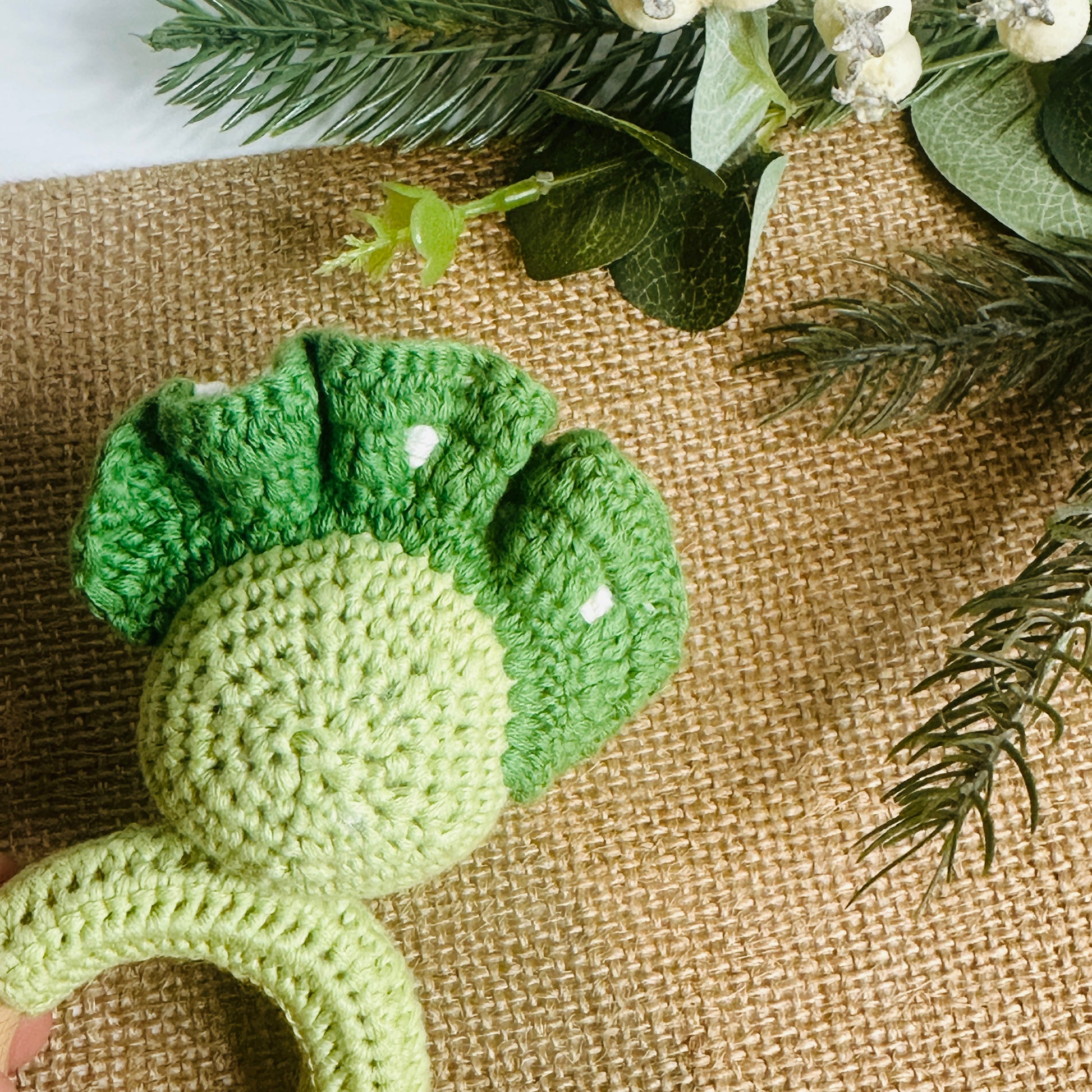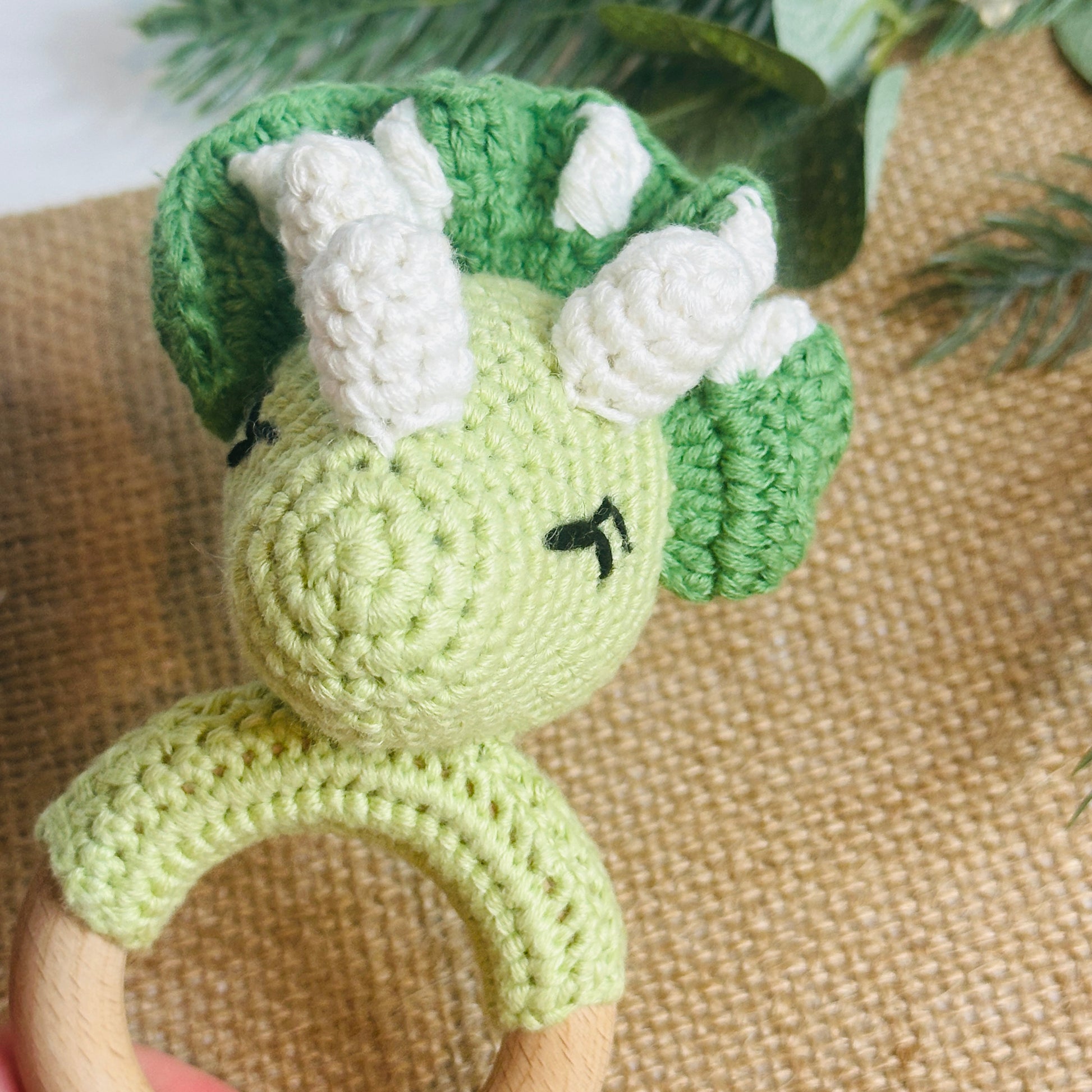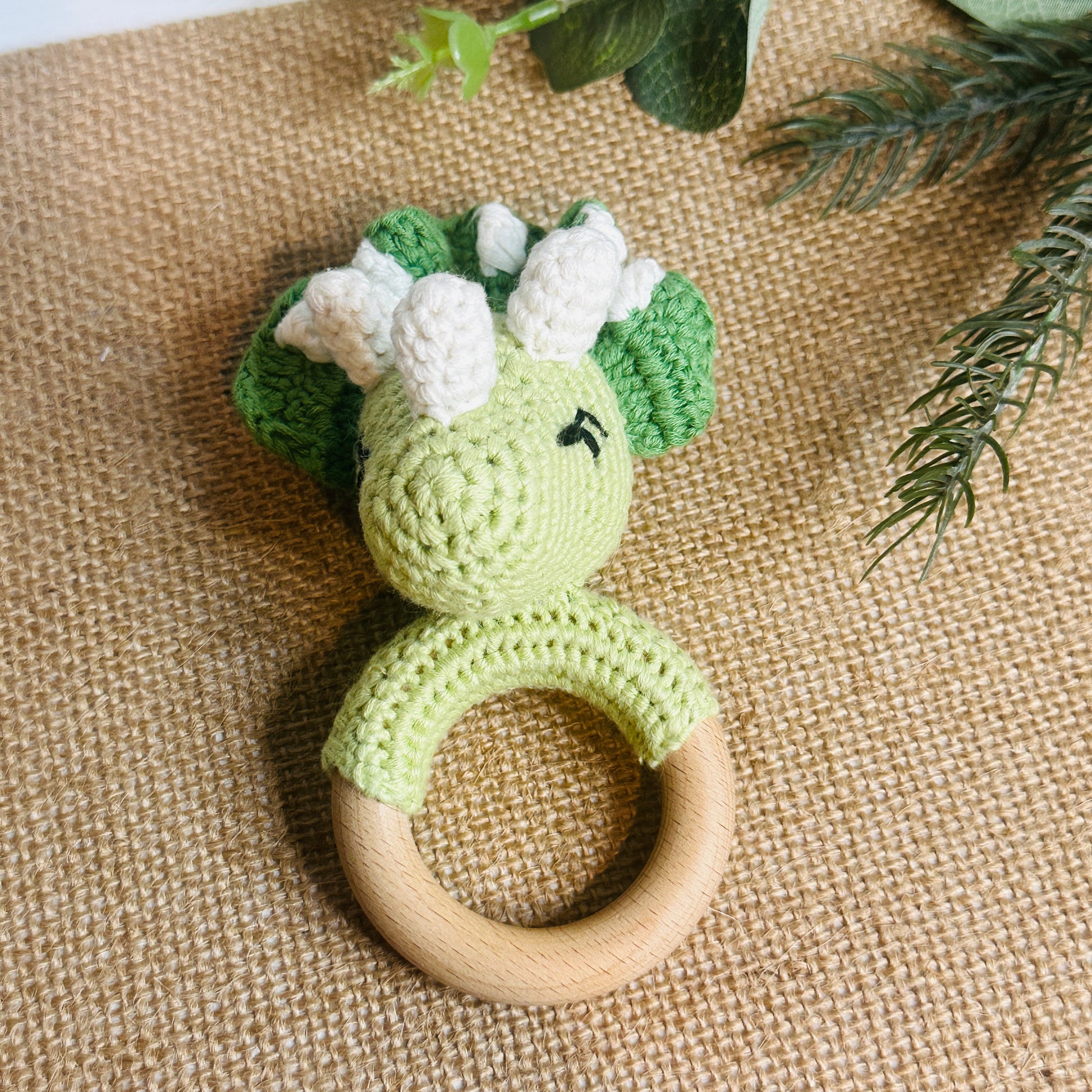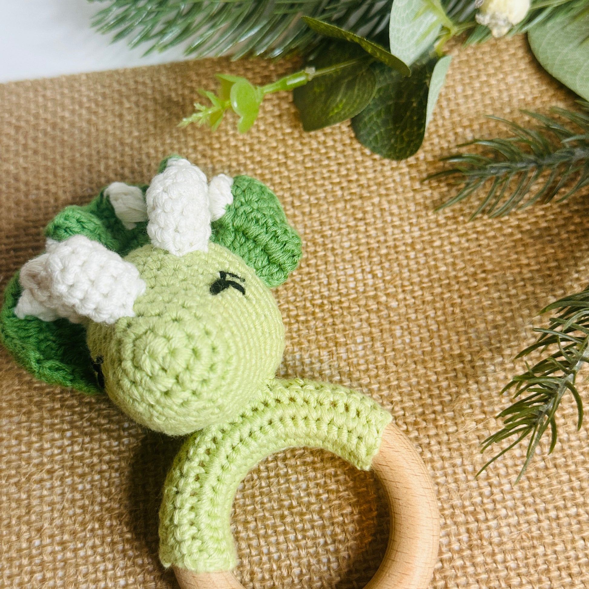 Keep your little one entertained with the Dino Rattle! This adorable crochet rattle not only serves as a teether, but also makes a fun rattling sound. Perfect for tiny hands to grasp and play with. RAWR!